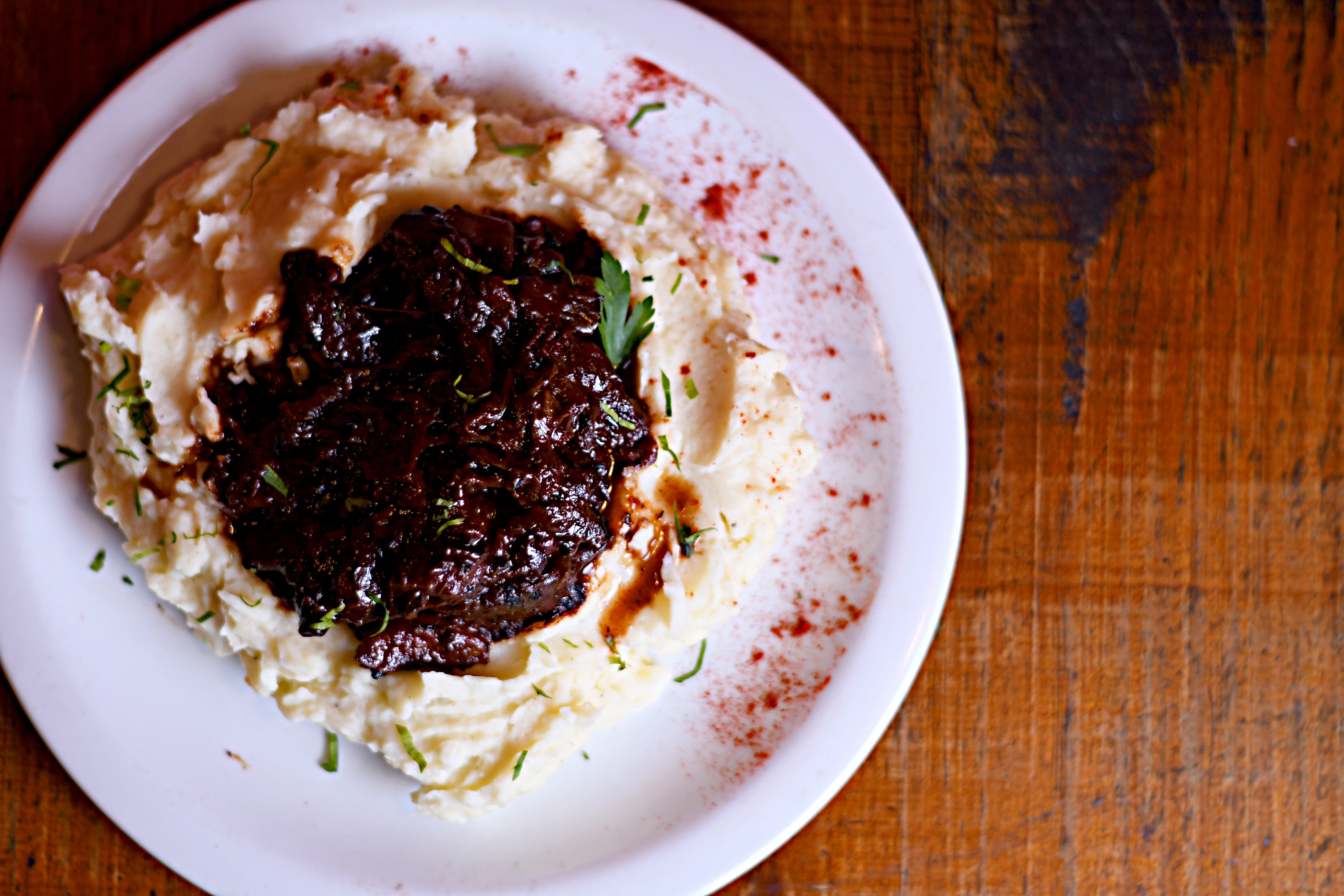 Pollo deshuesado marinado cocinados a fuego lento con ajo aceite de oliva, vino blanco y pimentón y chips de papas